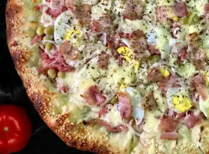 Molho artesanal, mussarela, frango desfiado, Bacon em cubos, Catupiry, orégano e azeitonas .